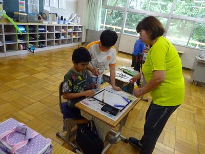 こちらの学級では国語の習字です。通常学級ですと、教育課程上、3年生から始める毛筆の学習ですが、支援学級では、1年生もチャレンジします。
