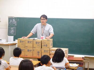 100マス計算が終わると、担任が黒板の前に怪しげな箱を用意しました。すごく重そうです・・・。これは、今日の学習である、10000を超える数の学習のために紙を10000枚以上持ってきたのでした!