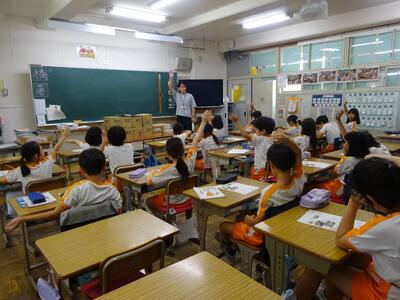 授業が始まると、号令の後に早速100マス計算です。100マス計算は、私も担任だったころはよく行っていました。何度も繰り返し行うことで計算が早くなったり得意になったりするので、計算力がつきます。