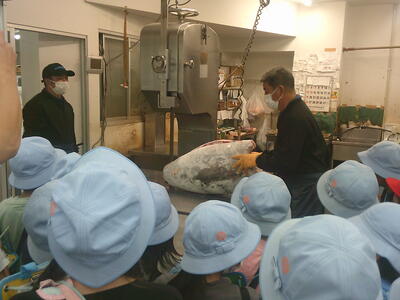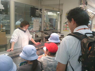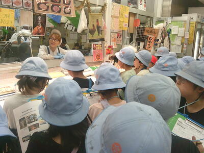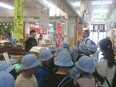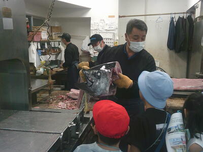 卸売市場では、野菜が様々な都道府県の産地から送られていることを学び、お肉屋さんでは牛の部位ごとに肉が売られていることや値段が違うことを知りました。魚を電動のこぎりで解体する作業を見る貴重な体験もできました。