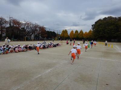 1,2年生は、校庭を大回り2周したあと、中トラック、小トラックと走り、ゴールとなります。