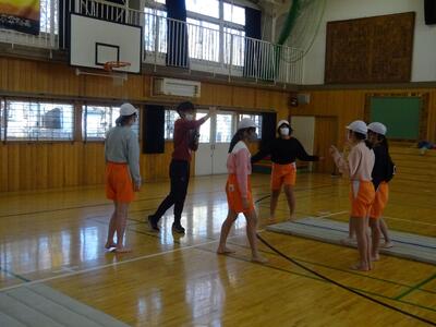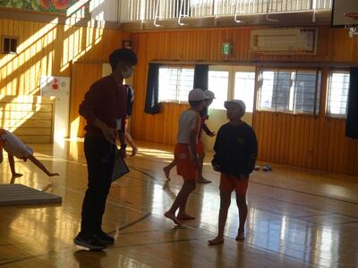 寒い中ではありますが、体育の授業は外でも中でも実施しています。体育館では6年生がマット運動をしていました。