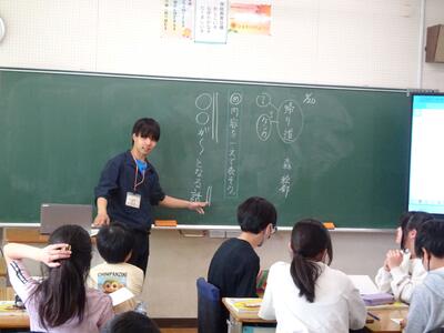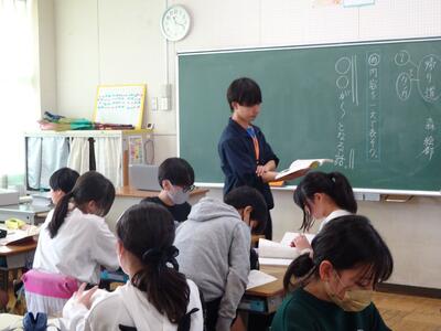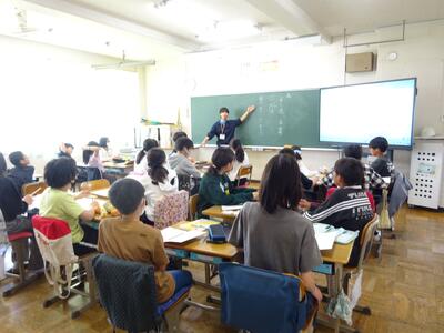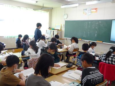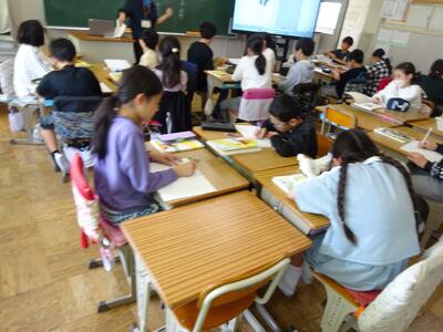 6年生の教室では、国語の学習をしていました。教科担任制を各学年で推進しているので、担任が教える教科数は少なくなっていますが、複数の目で学年の子供たちに関われるようになっています。