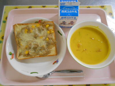 牛乳 和風ツナごぼうトースト かぼちゃのポタージュ |