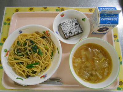 牛乳 豚肉とほうれん草のスパゲティ 白菜のスープ ブラウニー |